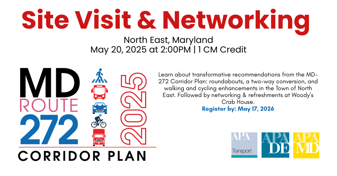 Welcome to the website of the Maryland Chapter of the American Planning Association. Our mission is to make great communities happen in Maryland by offering continuing professional development and other valuable services to our members that will enable them to excel in their practice. We advocate for excellence in planning, promoting education and citizen empowerment, and providing our members with the tools and support necessary to meet the challenges of growth and change. We hold a biennial conference, produce a monthly newsletter, offer continuous opportunities to network, and provide new and varied educational opportunities across the state.