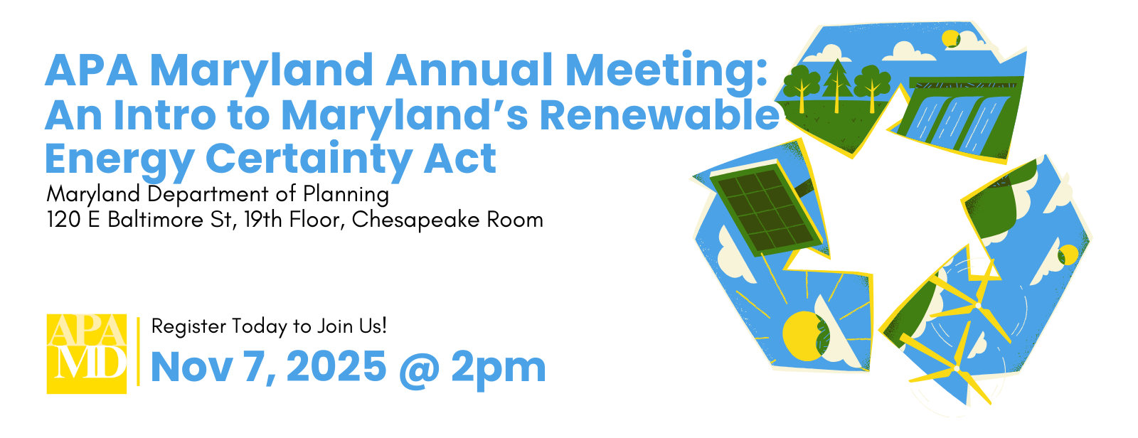 Join us at the APA Maryland Annual Meeting on Friday, November 7, 2025, at 2:00 p.m. at the Maryland Department of Planning in Baltimore!